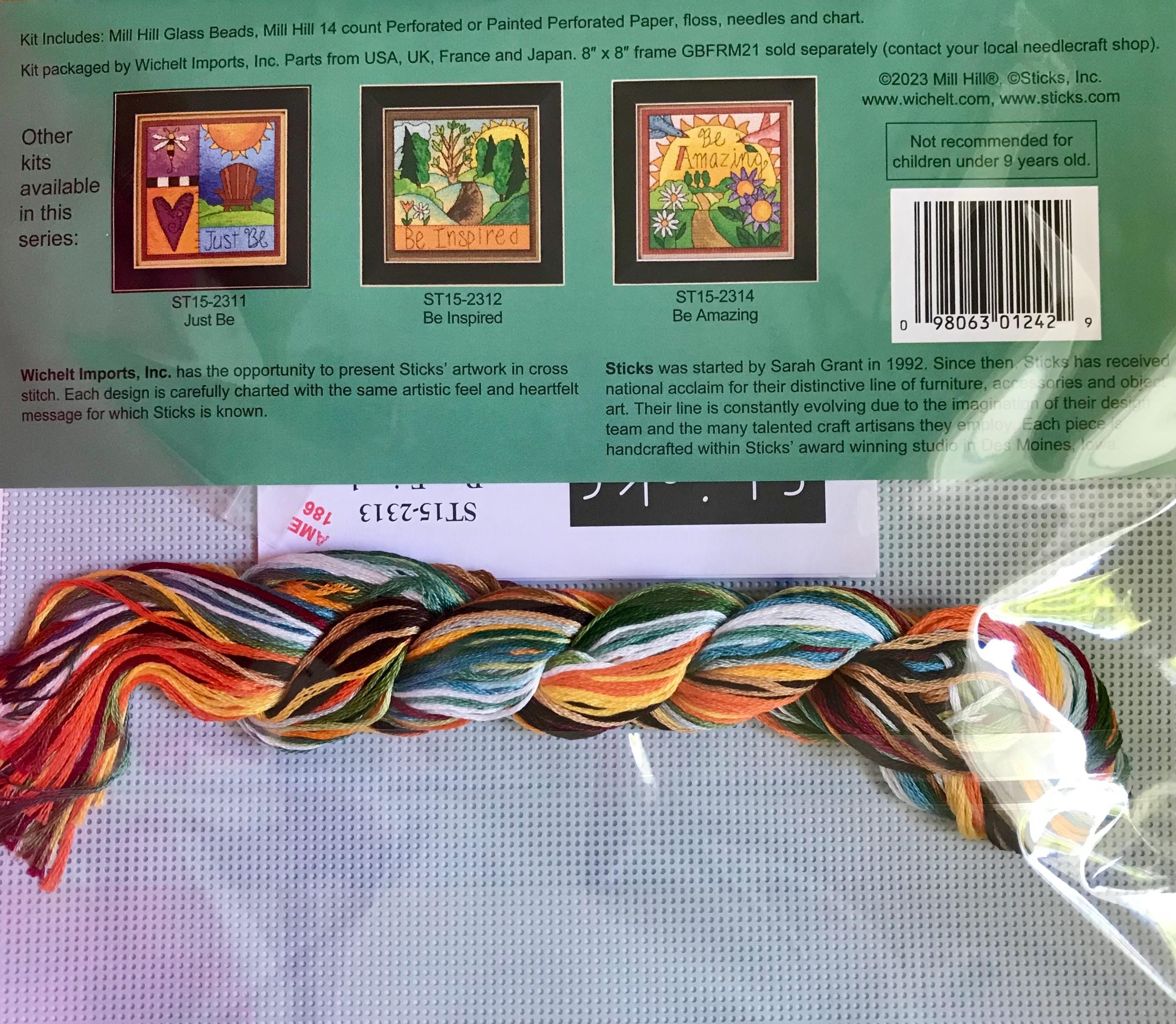 Everything you need to stitch this project is included: included are Mill Hill Glass beads, 14 count soft blue perforated paper, floss, needles and chart. This kit is counted….not printed.